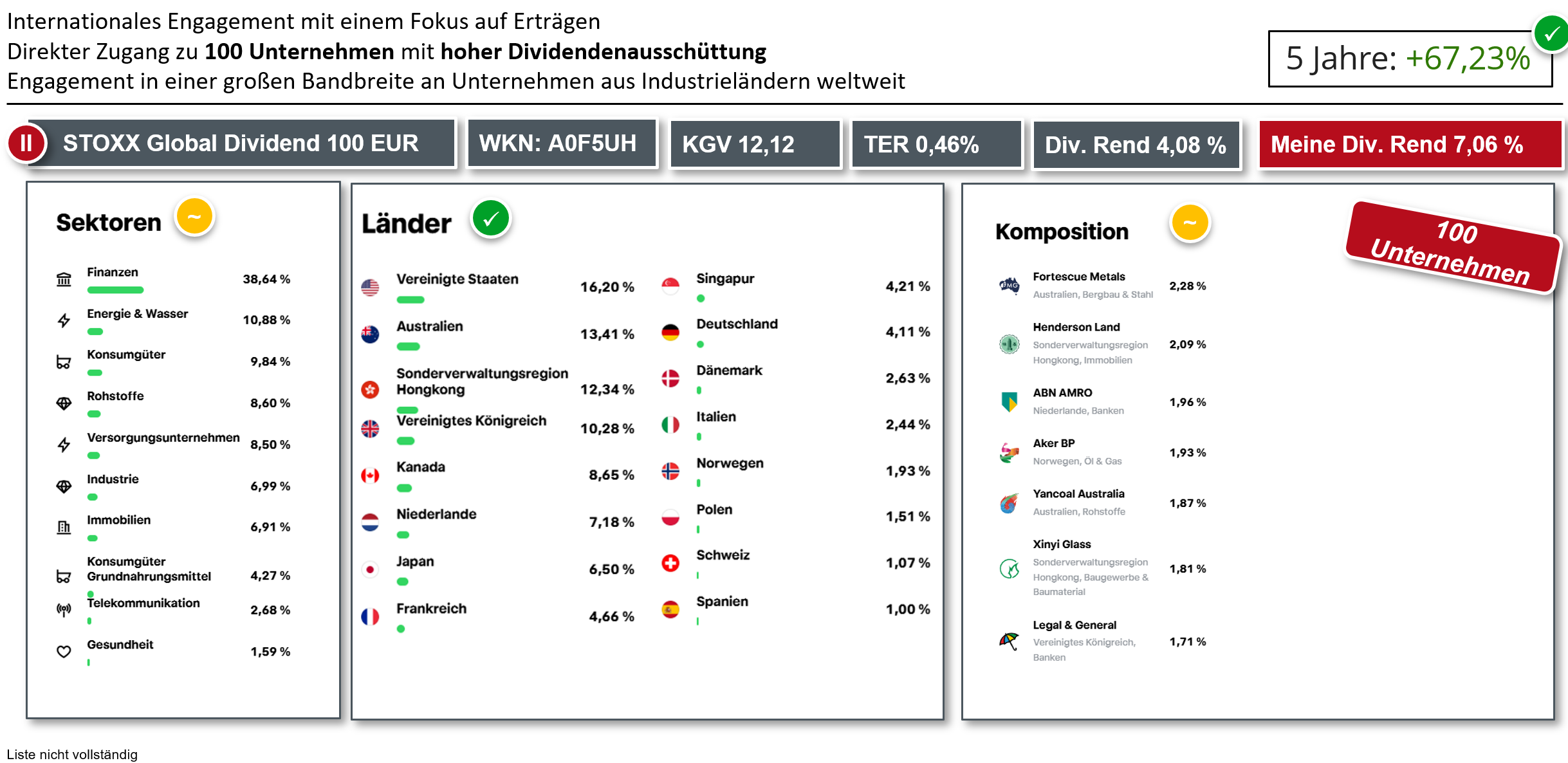 Dieser Klassiker setzt auf eine feste Auswahl der 100 dividendenstärksten Aktien weltweit. Die Auswahl ist geografisch fest vorgegeben: 40 Werte stammen aus Nordamerika sowie jeweils 30 aus Europa und dem Asien-Pazifik-Raum. Dies garantiert eine ausgewogene globale Verteilung jenseits der reinen Marktkapitalisierung.