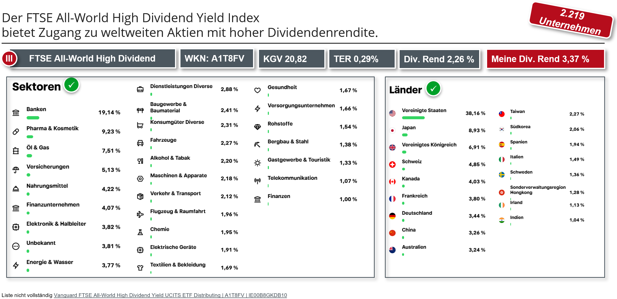 Dieser ETF ist ein Basisinvestment für Einkommensinvestoren. Er bildet den FTSE All-World High Dividend Yield Index ab und investiert weltweit in über 2.200 Unternehmen aus Industrie- und Schwellenländern, die eine überdurchschnittliche Dividendenrendite aufweisen. Durch die breite Streuung über verschiedene Branchen und Regionen gilt er als besonders stabil.