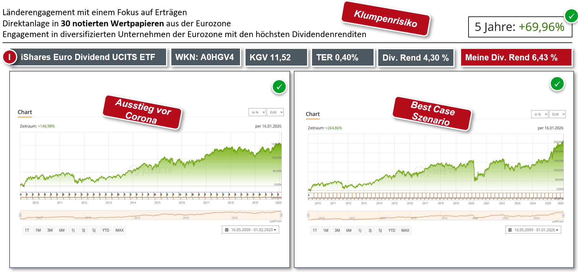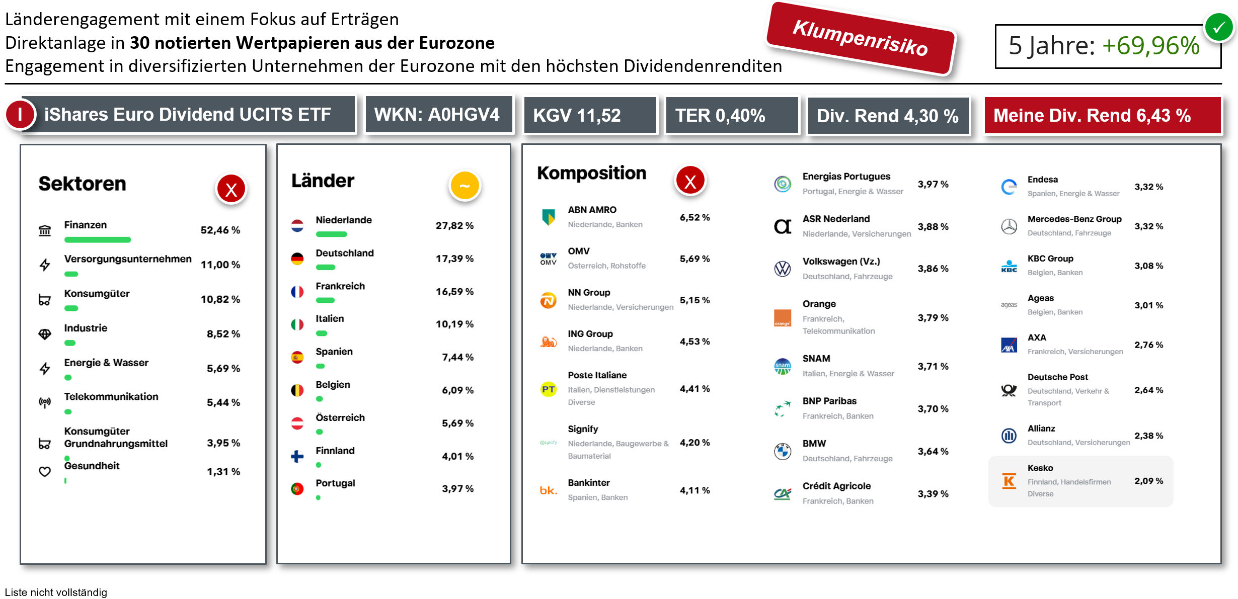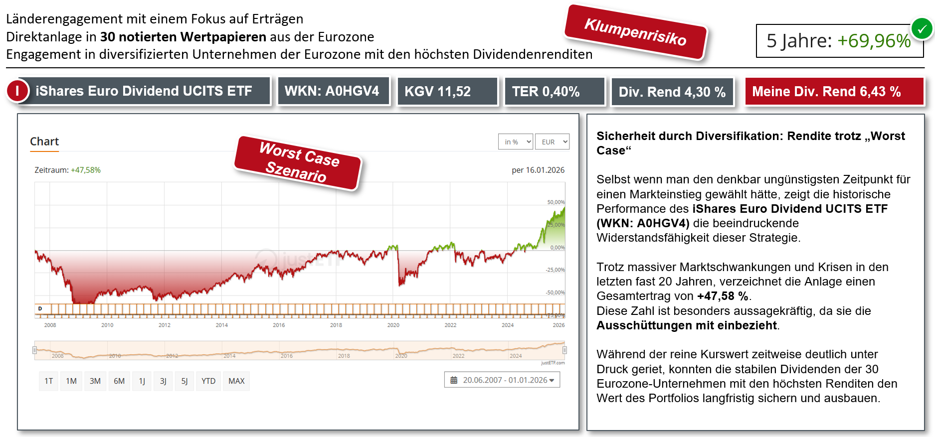 Mein Fazit: Ein Klumpenrisiko innerhalb eines einzelnen ETFs ist nicht dramatisch, solange das Gesamtportfolio breit genug aufgestellt ist. In meiner Strategie dient der iShares Euro Dividend als gezielter „Rendite-Booster“ für den europäischen Raum, während die anderen ETFs für das nötige Sicherheitsnetz sorgen.