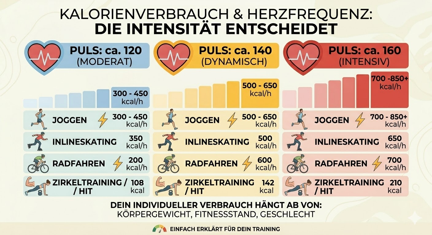 Warum der Puls alles entscheidet: Je höher dein Puls, desto mehr Sauerstoff muss dein Herz in die Muskeln pumpen. Da die Verbrennung von Nährstoffen (Fetten und Kohlenhydraten) Sauerstoff benötigt, steigt der Kalorienverbrauch mit der Herzfrequenz fast linear an. Während du bei einem Puls von 120 oft noch im aeroben Bereich trainierst (Fettstoffwechsel-Training), verlangst du deinem Körper bei 160 Schlägen Höchstleistungen ab, was den Verbrauch massiv in die Höhe treibt.